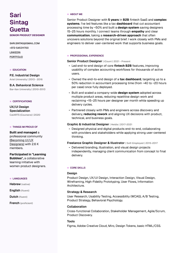 I’m a designer with a background in Behavioral Science and Industrial Design, focused on how people actually think and use products. I turn complex B2B systems into intuitive, human experiences by unifying fragmented features into scalable, long-lasting products, owning clear design-to-dev processes and robust systems that help both the product and the team grow.